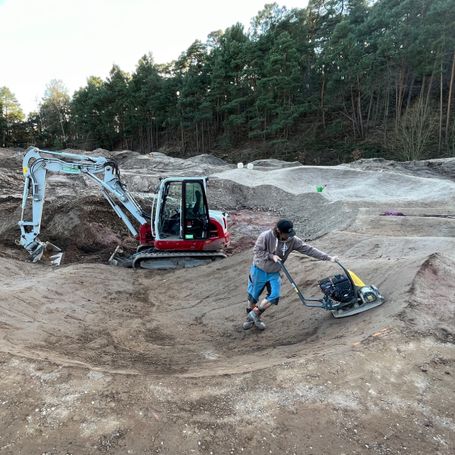 Nachdem mit großem Gerät (Bagger, Radlader etc.) die Basis geschaffen wurde, ging es nach der Feinmodellierung in Zusammenarbeit mit einer Fachfirma an das Asphaltieren. Außerdem wurden Böschungen mit Steinen und Stämmen abgestützt und gestaltet.